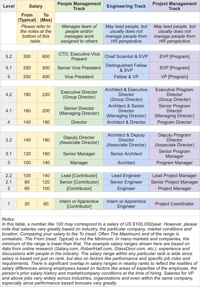 This system isn’t meant to be rigid. It is designed to find a good balance with most organizations. That balance, i.e. how many “levels of authority” there are will differ across organizations. The focus of this article is to provide a technical track as an alternative to management tracks, whether there are 3 levels or 13. There are pros and cons of having fewer “bands” or ranks. (As a side note, some organizations like the military ((US Military Ranks)) require lots of ranks.) Ranks need not signify a strict hierarchy where one can only go from one rank to the one immediately above. The ranks could simply be used as “salary bands” and the levels of “hierarchy of authority” could be fewer.