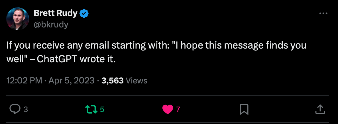 Here are some tips based on my experience to help you spot the telltale signs that an email might have been crafted by an AI language model. They can be used to recognize patterns in emails generated by LLMs in their default settings. The signs below may not be present in emails generated using LLMs that are fine-tuned or use sophisticated prompts to guide the LLM’s writing style.