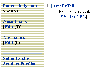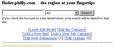These URLs are stored in a database that allows a URL to be classified in more than one appropriate, editor created category. Categories have their own entry in the database as well. In that entry html can be associated with them, for display on their page, along with the attribute of belonging to a parent category. In this way, PhillyFinder can grow organically. New categories, that are discovered to be needed, can be added with the interface quickly. And links can be re-classified simply.