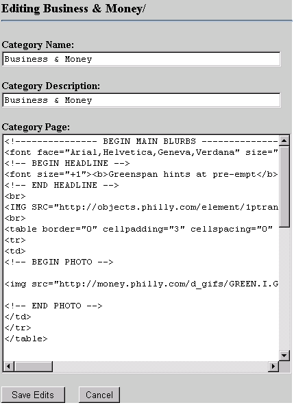 This is the Category Edit form. It is used to edit or delete existing Categories and to add new ones. This is an example of editing an existing Category, that has static HTML to be displayed in the Category Page field. The "Delete Category" button is only present if you navigated to this page from the left-hand category bar.