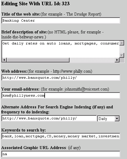 This is the top half of the URL edit form. An end user, not an editor, has only the first four fields displayed. Our Site Server for indexing uses the Alternate Address field. The frequency is how often it will reindex that site. Keywords are used by database searches users may execute. Editors can type in what they feel is appropriate. Associated Graphic URL is an optional field that can be used in the display of that URL.