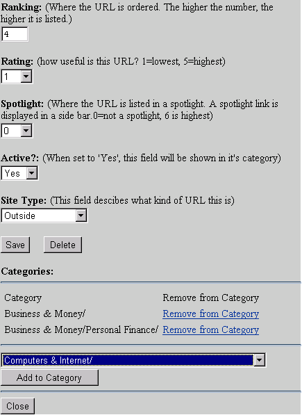 This is the second half of the URL edit form. End users see none of these fields when submitting URLs. Most fields here are self-explanatory. The Active field is the approval field. Site type allows us to categorize the URL for display and searches. The Categories interface will allow simple removal from a category by clicking "Remove from Category". The "Add To Category" button will add this URL to the category chosen in the drop down list. You can save the URL's information by clicking "Save" or delete the URL in its entirety by clicking the "Delete" button.