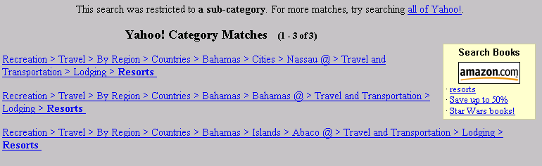 The first part of her results were fine as expected. Yahoo searched its directory for the word resorts and got back results only from sites listed within that category.
