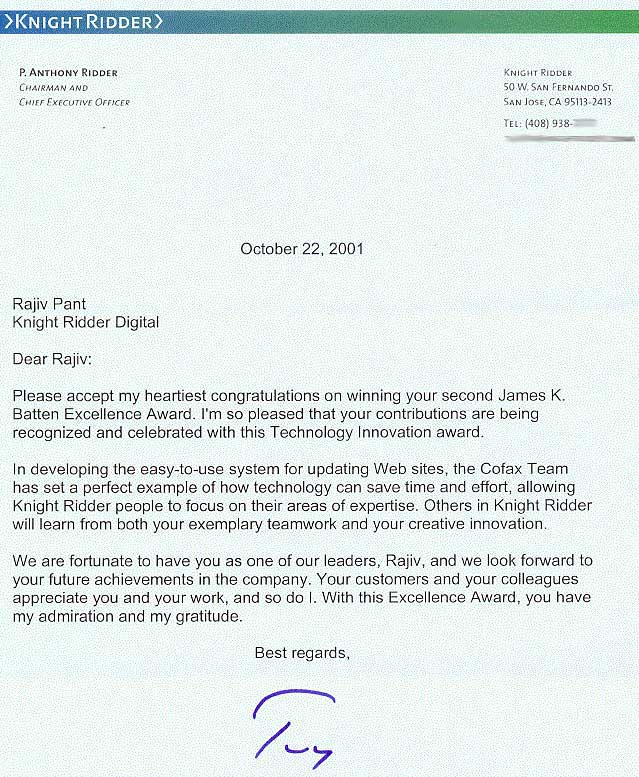 Congratulatory letter from Tony Ridder, Chairman & CEO, Knight Ridder
