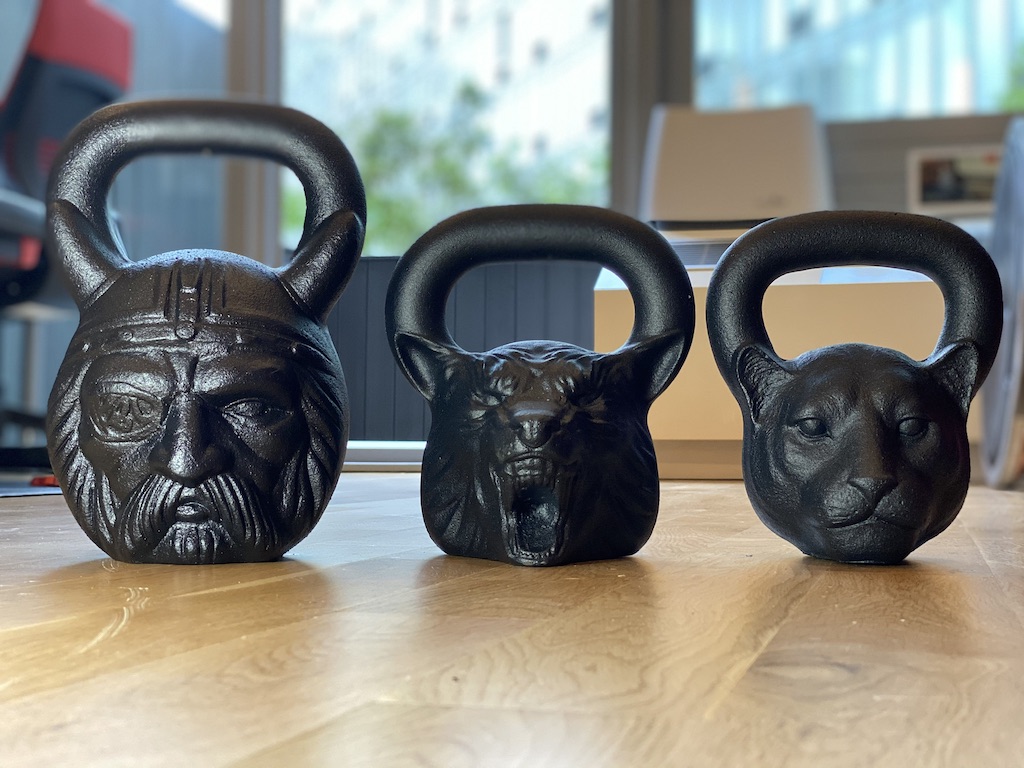 Some of the kettlebells that I use: 29 kg (63 lb) Odin, 16 kg (35 lb) Wolf, and 12 kg (26 lb) Panther. Made by Zoobells.