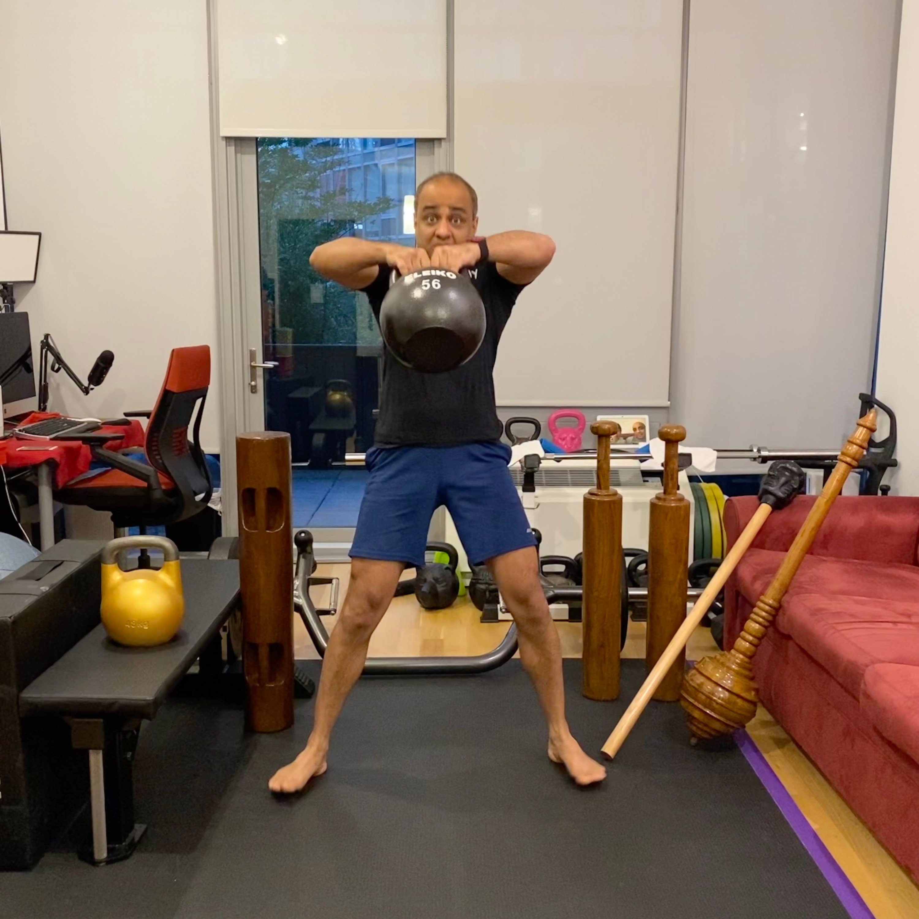 123.45 lbs/56 kg kettlebell swings! Next, learn to do them with a smiling face 😃