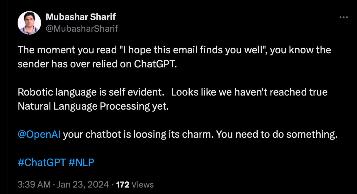Here are some tips based on my experience to help you spot the telltale signs that an email might have been crafted by an AI language model. They can be used to recognize patterns in emails generated by LLMs in their default settings. The signs below may not be present in emails generated using LLMs that are fine-tuned or use sophisticated prompts to guide the LLM’s writing style.