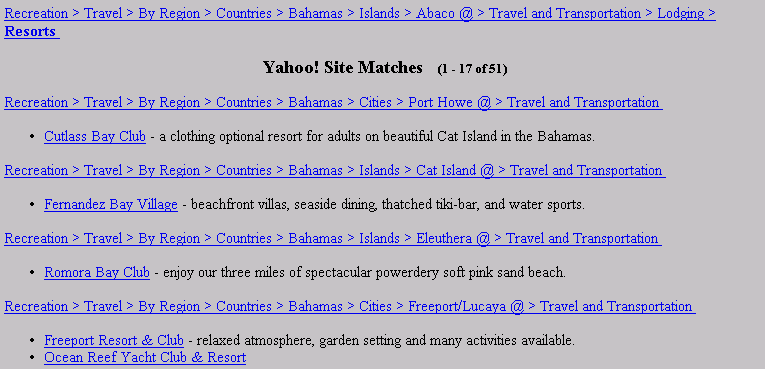 For an example of this, consider Yahoo. A user Alice who lives in Philadelphia wanted to travel to the Bahamas. She went to Yahoo and browsed to the category "/Recreation/Travel/By_Region/Countries/Bahamas/" as shown below.